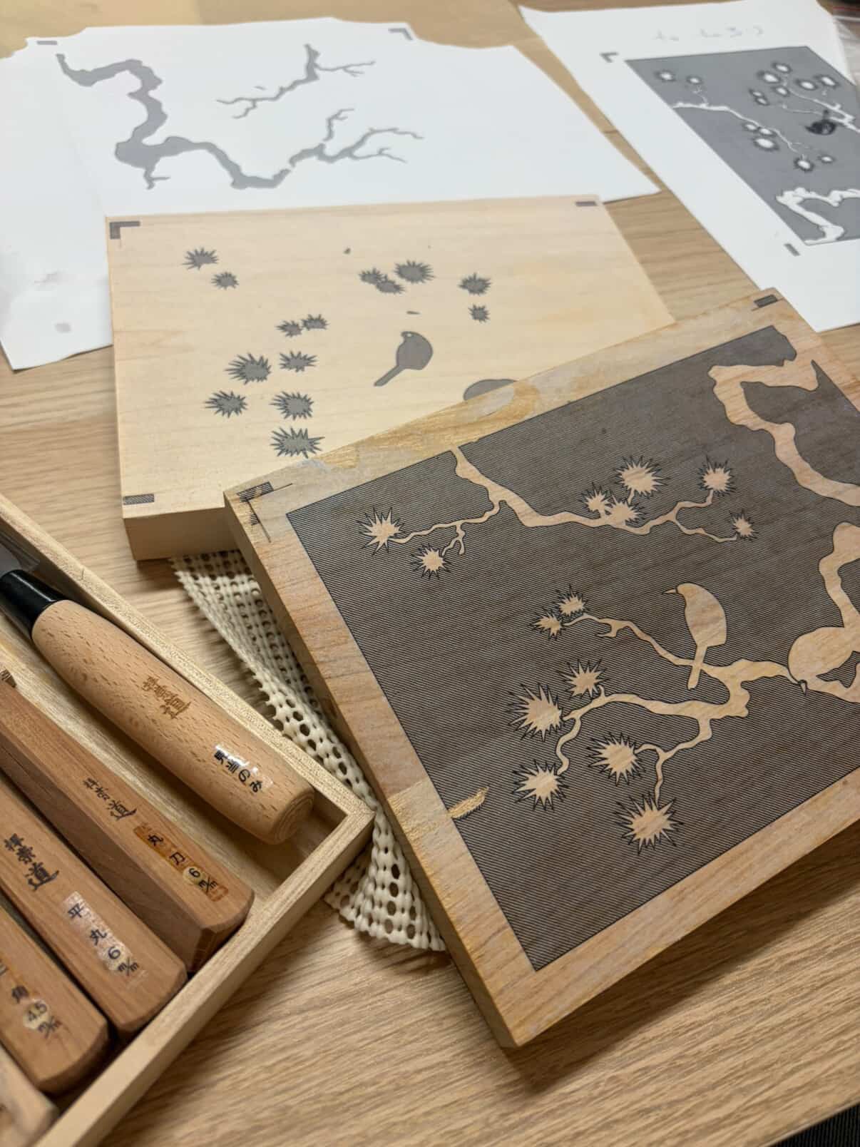 29 marzec 2026 – przenoszenie projektu na bloki, rozpoczęcie wycinania, stworzenie własnego noża hangi-to do mokuhanga, podstawy ostrzenia narzędzi;